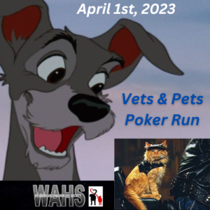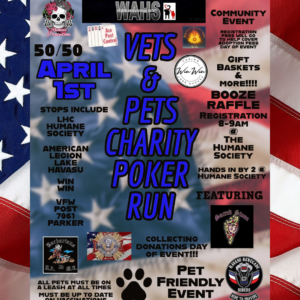 Vets & Pets Charity Run April 1st, 2023 Lake Havasu City. Join Veterans and others on this Poker Run to Benefit the Western Arizona Humane Society (WAHS) Motorcycles and ALL Vehicles are Welcome to Join the American Legion Veterans & Bring the Family out for this Fun Community Event of visiting Poker Stops followed by a Fun Afternoon at Western Arizona Humane Society.